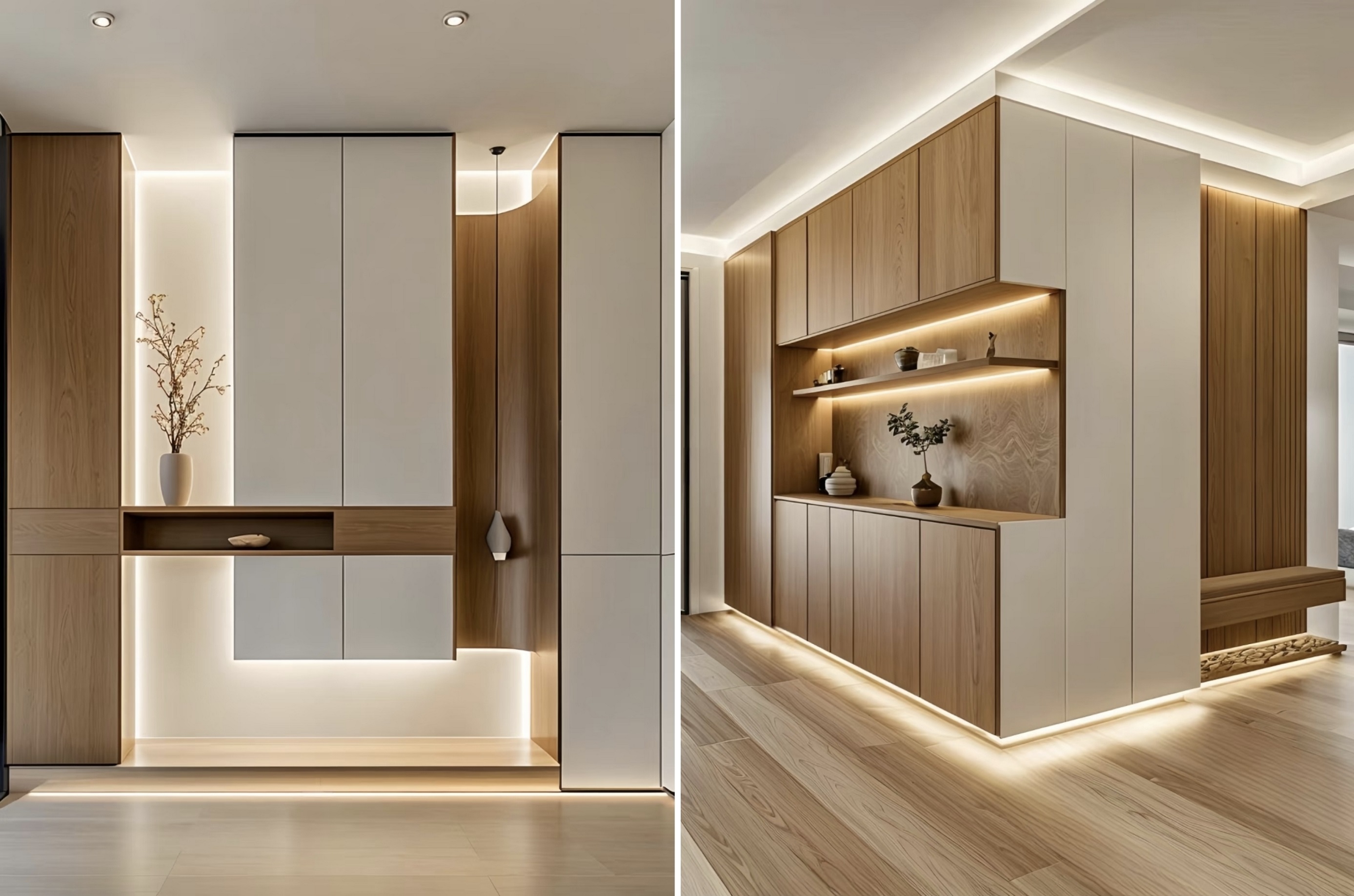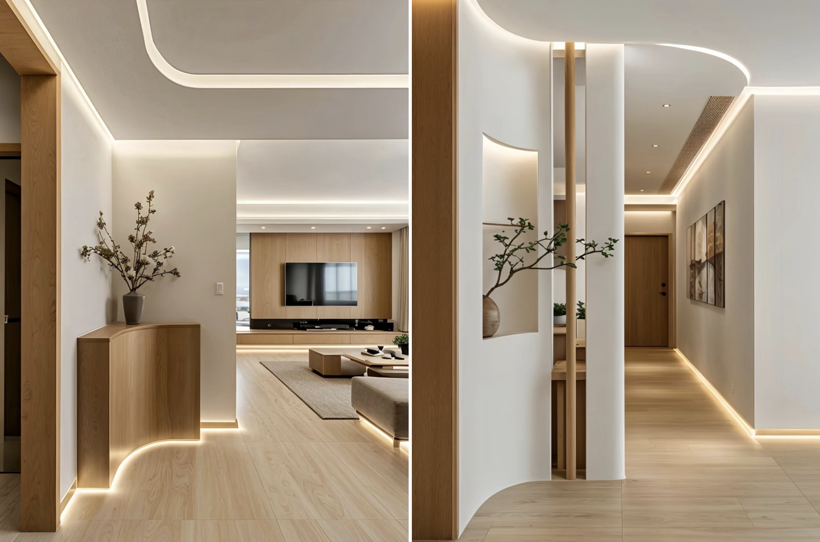 এন্ট্রিওয়েতে একটি ছিদ্রযুক্ত প্রাচীর সহ একটি বাঁকা নকশা রয়েছে যা প্রাকৃতিক আলোকে পরিচয় করিয়ে দেয়।