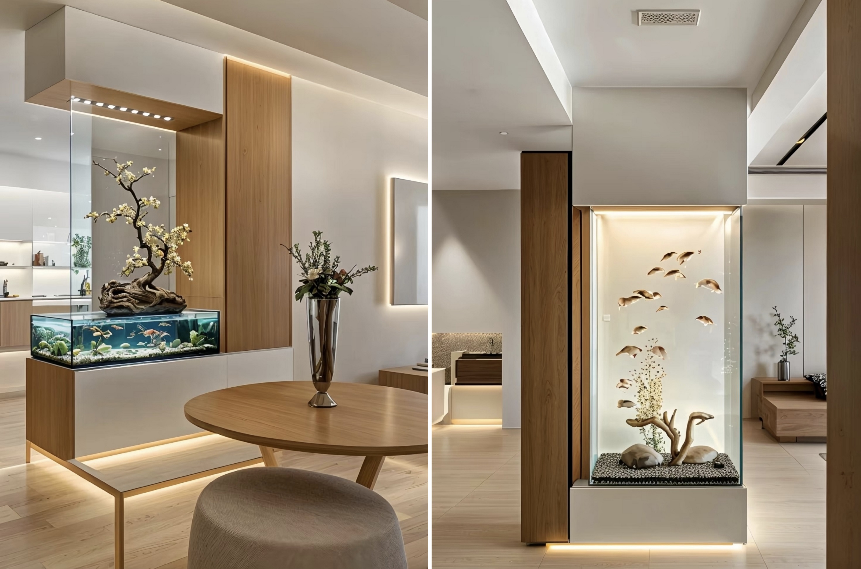 একটি ইকো-অ্যাকোয়ারিয়াম একটি কেন্দ্রবিন্দু হিসাবে কাজ করে, বাড়িতে একটি কৌতুকপূর্ণ এবং গতিশীল স্পর্শ যুক্ত করে।