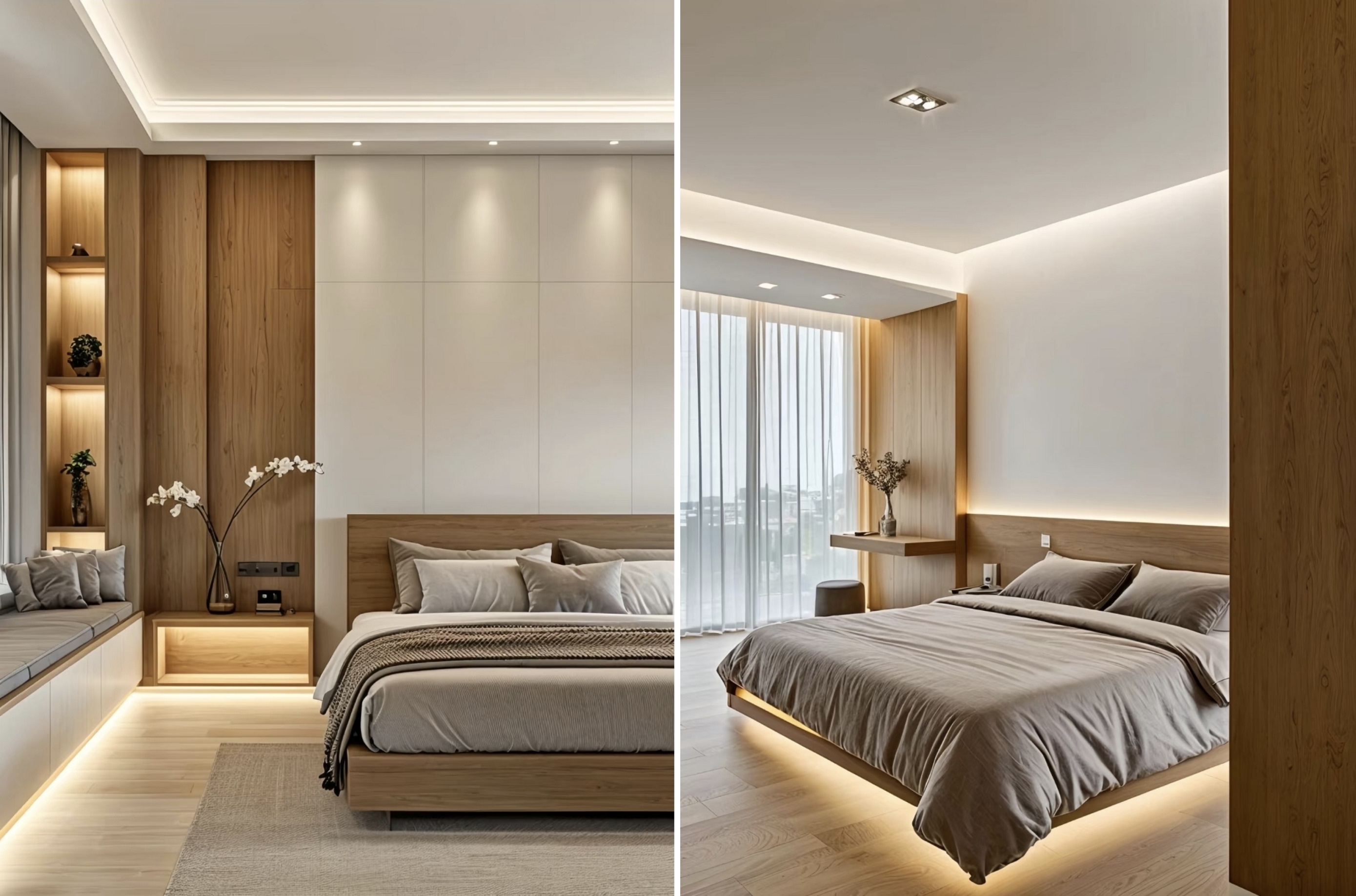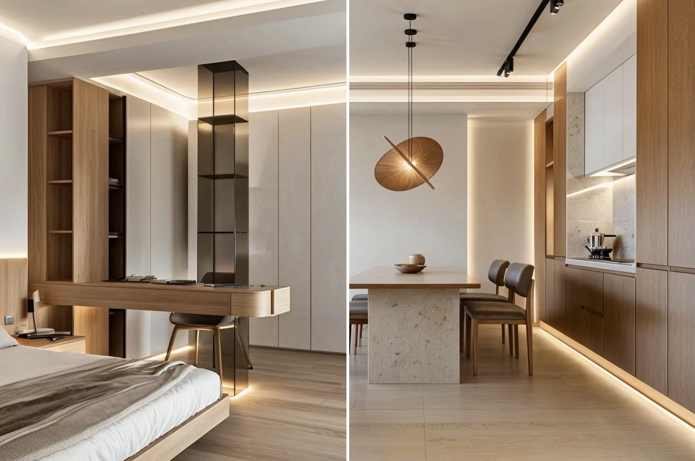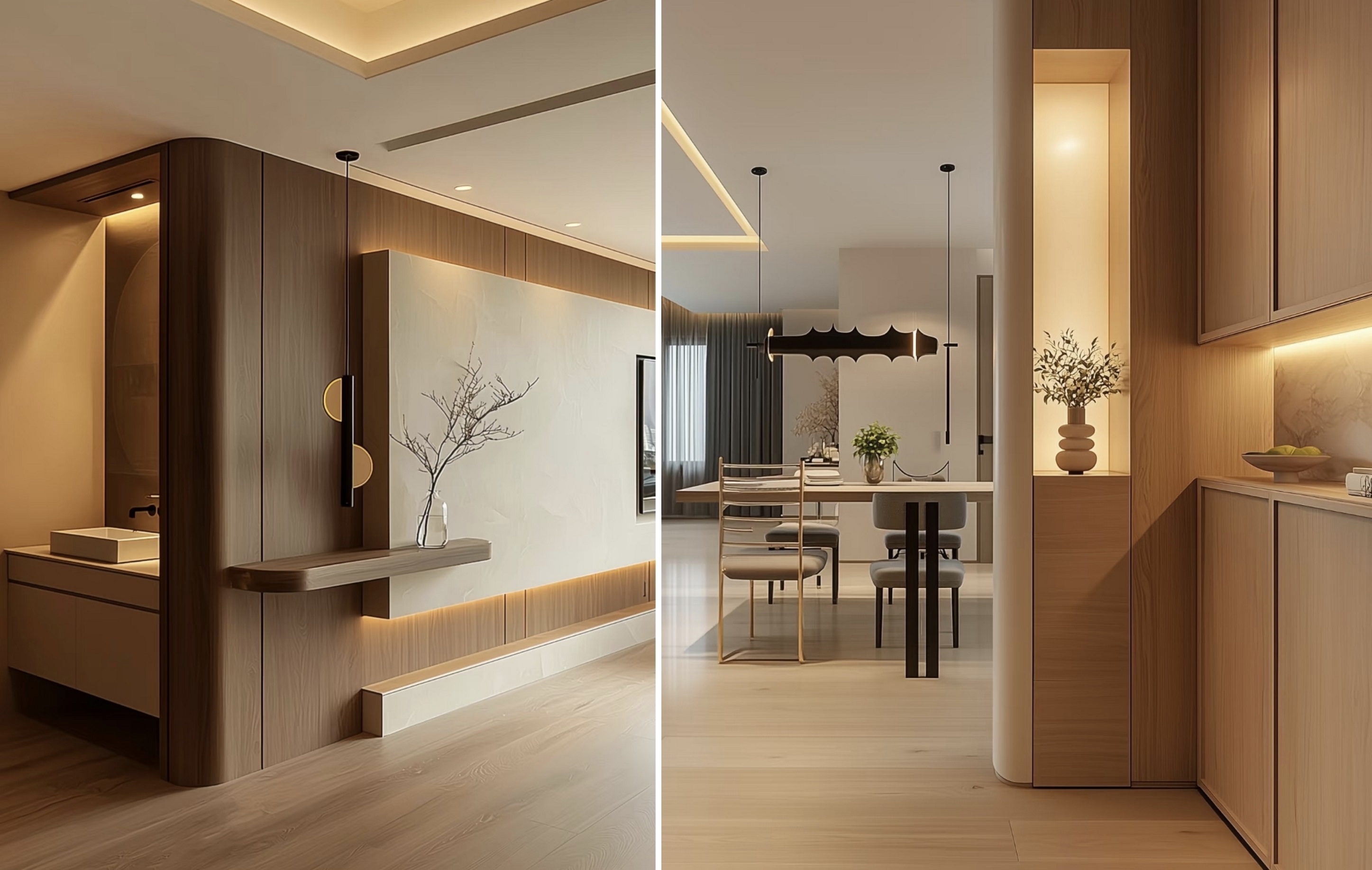 উষ্ণ, সূক্ষ্মভাবে সমন্বিত আলো স্থানটিকে শিল্পের কাজে রূপান্তর করে।